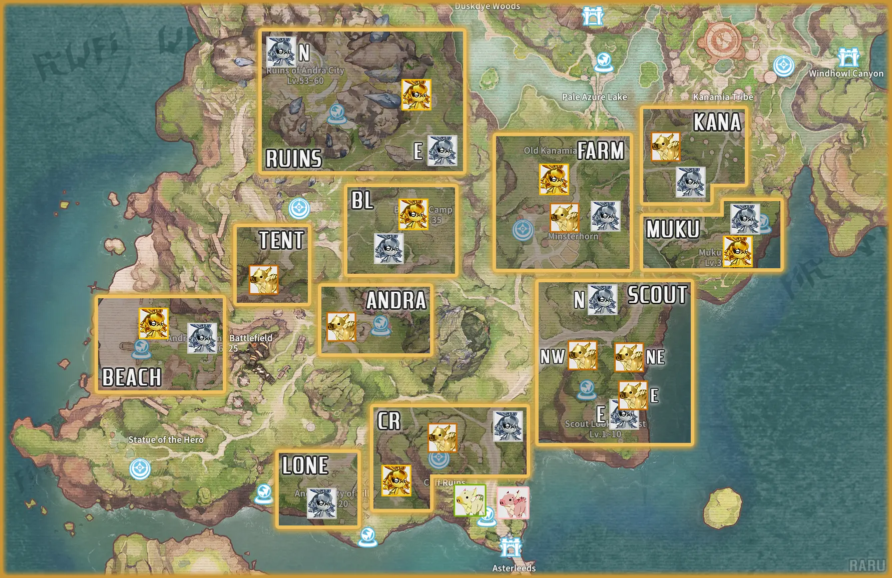Map of Asteria Plains and the locations of the rare spawns. Credit to map creator.