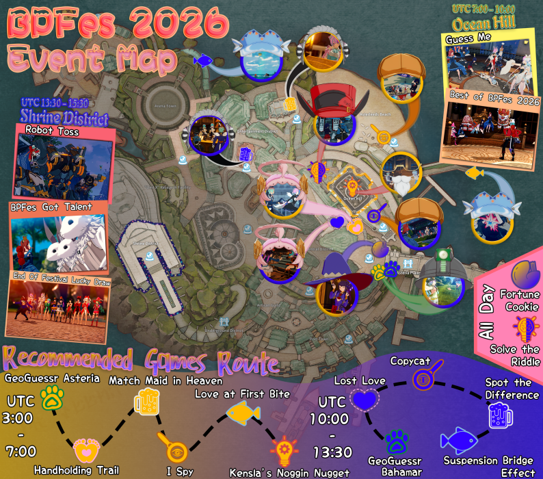 Discord community festival. Venue: Line 28, Asterleeds (changed from Line 88); nearby lines reserved for stall games. Game Shows: Best of BPFest @Ocean Hill 08:00–11:00 (Best Joke, Poem, Story, "How I joined my guild", "Why I still play BPSR", Best Couple - 1–3 min story format); BPFes' Got Talent @Shrine District 14:30–16:30 (top 8, themes: Chinese New Year, Dragon, Zodiac Horse, Love, Valentine's Day). Stall games: GeoGuesser, Handholding Trail, Match Maid in Heaven, Love at First Bite, Kensla's Noggins, Nugget Suspension Bridge Effect, Lost Love, Fortune Cookie & Trading Robot Toss, Spot the Difference, Copycat I Spy. Prizes: limited title "Lanterns ❤️ Lovebirds" (rewarded to outstanding minigame/contest players); stall stamps for lucky draw; game show winners get RO top ups.