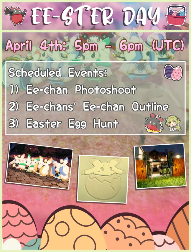 Join us for Ee-ster photoshoot day with your favourite Ee-chans! Organizers: Niryco or Kuwi. Preparations: Your cutest Easter outfit and/or Ee-chan toy. Activities: Homestead ee-ster egg hunt and Ee-ster photoshoots. Location: Starland, at starlight terminal, the beach with the large Ee-Chan and Rimsekai + Villea's homestead.