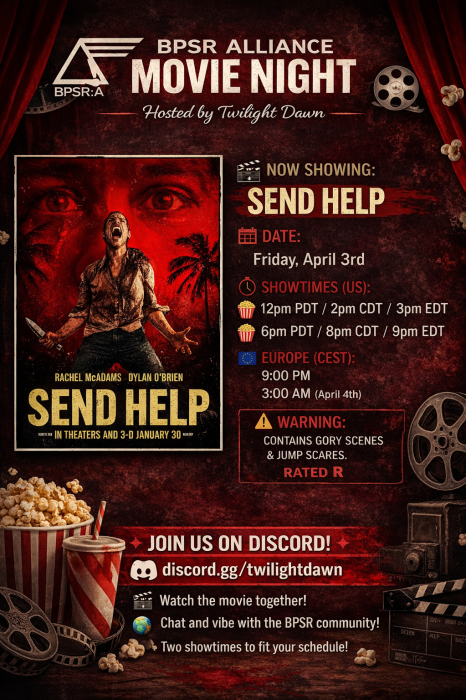 Community movie watch party for "Send Help" hosted by Twilight Dawn. Warning: contains gory scenes and jump scares (Rated R). Join the stream on Discord and optional in-game meetup at Edasch homestead (UID #74347332).