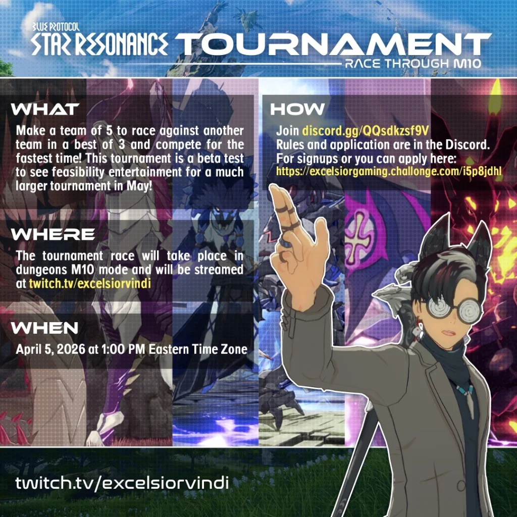 Excelsior Gaming community tournament (beta for a larger event planned in May). Teams of five race in M10 dungeon mode, best-of-three for fastest clear. April 5, 2026, from 1:00 PM Eastern (US), roughly a four-hour block (brackets, stream, wrap-up). Live stream: twitch.tv/excelsiorvindi.